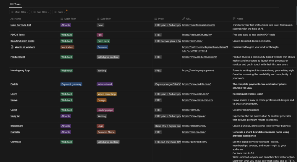 • Some of the tools are free, while others might require a subscription fee, so we added a "Price" filter.